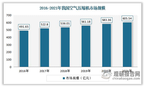 自2012年以來(lái),我國(guó)空氣壓縮機(jī)行業(yè)市場(chǎng)規(guī)模呈逐年上升態(tài)勢(shì)。從國(guó)內(nèi)空氣壓縮機(jī)行業(yè)銷(xiāo)售額來(lái)看,2020年我國(guó)空氣壓縮機(jī)市場(chǎng)規(guī)模從2016年的491.65億元增長(zhǎng)到了583.36億元。考慮到考慮到國(guó)內(nèi)節(jié)能環(huán)保相關(guān)政策日趨嚴(yán)格,行業(yè)節(jié)能改造需求將持續(xù)提升。估計(jì)2021年我國(guó)空氣壓縮機(jī)市場(chǎng)規(guī)模可以達(dá)到605.54億元。
